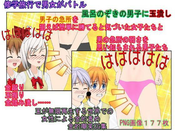 金的・金的嘲笑のエロCG集。女が金的を蹴り痛がる男を笑う、自分たちの股間の頑丈さを誇示して嘲笑する、そんな感じのフェチ作品。玉を潰そうが死のうが再生するバーチャルな世界に卒業旅行に行った男女。羽目を外して女子風呂を覗く男子たちに女子たちが金潰しのお仕置き。懲りない男子たちと戦争。掴まえてフルチンにして短小包茎を嘲笑し、みっちり玉潰し去勢で男の弱さをわからせる。