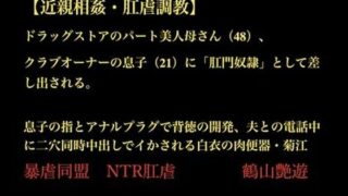 同人 【d_703528】【近親相姦・肛虐調教】 ドラッグストアのパート美人母さん(48)、 クラブオーナーの息子(21)に「肛門奴●」として差し出される。 息子の指とアナルプラグで背徳の開発、夫との電話中に二穴同時中出しでイかされる白衣の肉便器・菊江【暴虐同盟】